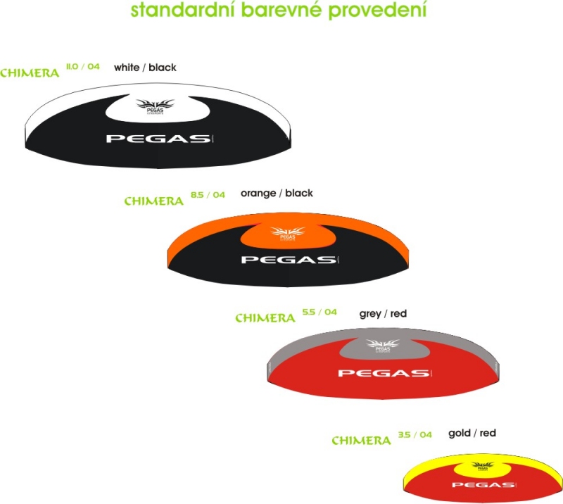 Chimera je několikátá generace populárního českého draka. Tentokrát přišli vývojáři z fabriky Pegas se zcela novým systémem vyvázání draka - jako třílajny. Drak si přitom zachovává standardní ovladatelnost čtyřlajn, ale má oproti mnohým ještě něco navíc. Draky Chiméra používáme v naší škole snowkitingu a landkitingu. Jsou to hodní, stabilní draci. Tento model Chiméry byl odzkoušen v náročných podmínkách krkonošských plání a také v Alpách ve 3200 m n.m.