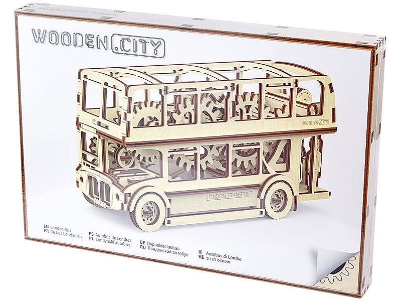 Ponořte se do pulsující atmosféry Londýna při sestavování mechanického 3D modelu slavného dvoupatrového londýnského autobusu. Součástí balení je gumový páskový motor, který natočíte dřevěným klíčem a tím autobus spustíte. V tomto modelu jsou instalovány dvě spouštěcí páky pro ovládání úrovně rychlosti a směru jízdy. Poslechněte si také zvuky motoru, které výrobce pečlivě zpracoval ve výrobním procesu pro realističtější zážitek z jízdy. V londýnském autobusu najdete také tři pasažéry, jejichž bezpečnost bude ve vašich rukou. Dřevěný 3D model Londoon Bus bude skvělou dekorací do vašeho interiéru.