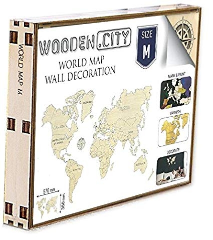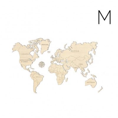 Dřevěná mapa světa, která se skládá z několika samostatných kontinentů a ostrovů je k dispozici ve 4 různých velikostech. Světovou mapu můžete umístit přímo na zeď, kde tvoří příjemný stínový efekt. Krajiny na mapě jsou velmi podrobné a do mapy jsou vyryté laserem. Mapu lze sestavit velmi jednoduše, intuitivně pomocí připravených k montáži laserově řezaných dílů. K umistění mapy na zeď slouží oboustranná páska, která je součástí balení. Skvělá originální dekorace do interiéru, která Vám bude sloužit několik let.