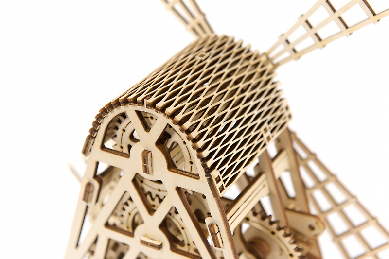 Sestavte si krásný dřevěný mlýn, který nebude sloužit pouze jako dekorace, ale po jeho sestavení můžete sledovat celý proces rotace, kdy větrný mlýn spouští ozubená kola, mezi nimiž je setrvačník a skutečný planetový převod. Tento proces můžete sledovat díky gumovému páskovému motoru, který je součástí balení. Motor natočíte dřevěným klíčem, a tím spustíte větrný mlýn se spouštěcí pákou.